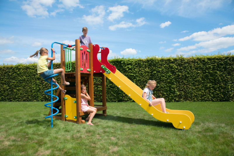 Equips d’escalada amb una paret de roca en un costat i un tobogan d’acer inoxidable i una escala vertical a l’altra banda per a nens de 3 a 12 anys. A la base hi ha una caseta de joc amb banc de seient. La cabana de muntanya és ideal per a superfícies ja endurides perquè només s’ha de fixar el tobogan a terra. Les bigues inferiors es poden fixar al terra mitjançant fixacions a terra (T600). Per a això es necessita formigó. Totes les peces metàl·liques estan tractades contra el rovell i el poliester i totes les femelles i els cargols estan completament recoberts amb taps de protecció en forma de flors. Aquest equip de joc es pot ampliar amb un pal de bombers (ref. S010) o un pol de bombers en espiral (ref. S020).