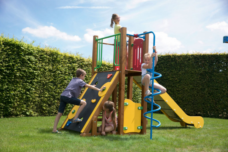 Equips d’escalada amb una paret de roca en un costat i un tobogan d’acer inoxidable i una escala vertical a l’altra banda per a nens de 3 a 12 anys.