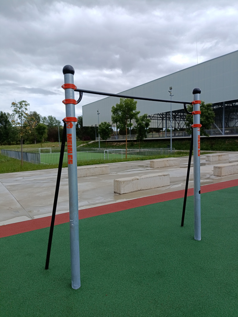 Sobre una superficie amortiguante de 220 metros cuadrados se han instalado siete grupos de elementos en acero galvanizado para la práctica de calistenia, destacando un conglomerado de barras y estructuras denominado ‘kronos’ que incluye una escalera horizontal; ocho barras para dominadas a distintas alturas que se adaptan a las necesidades técnicas de los diferentes usuarios; dos bancos de abdominales y barras paralelas, y anillas para la realización del trabajo gimnástico. Además, los espacios disponen de cartelería específica con un código QR con las recomendaciones de seguridad e instrucciones básicas de uso.