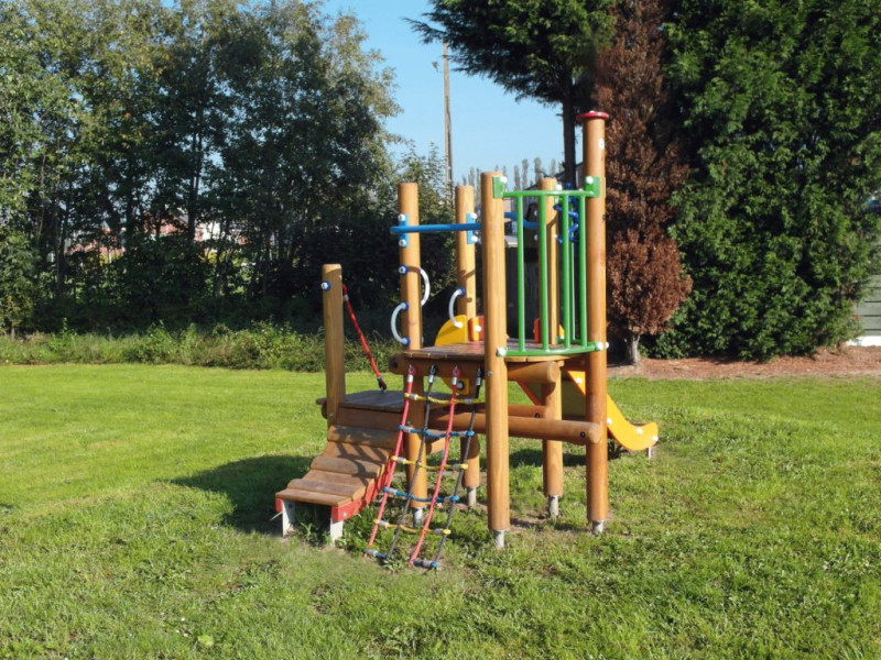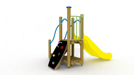 Colorful game play for children from 2 to 6 years. The game tower consists of two platforms, one on top of the other. A plastic slide starts from the upper platform with a height of 84 cm. The playhouse can be accessed through an easy staircase with metal handrails and an HDPE polyethylene rock wall with plastic climbing handles. The highest platform has a balustrade with a colorful metal door. Round larch wood posts have a diameter of 10 cm and are fixed on the floor with metal footrests.