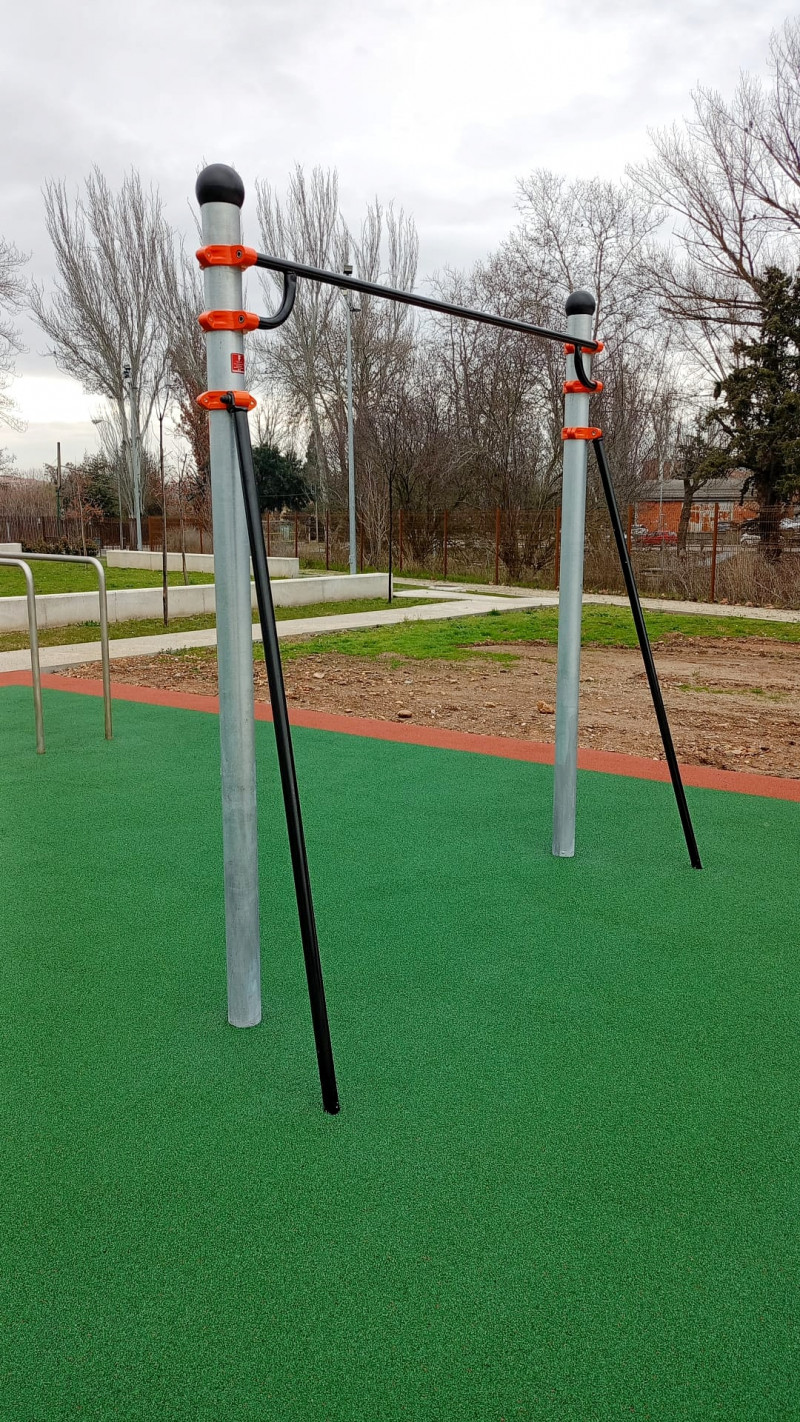 The bar that constitutes this structure is 34mm in diameter. The bar is joined to the columns by two points, this gives it more firmness and consistency. The length of the bar is 2m. The tube used for the columns is 100mm in diameter and is galvanized. Cast zinc treatment that gives it great protection. The columns have a height of 2'40m and a reinforcing bar anchored to the ground to support the swing of the structure.