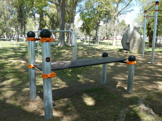 Phenolic plywood wood platform of 25mm x 500mm x 1500mm. Bar plasticized at 15cm height of the platform whose purpose is the subjection with the hands to make leg elevations or the other way around; a clamping with the feet to make elevations of the upper trunk.