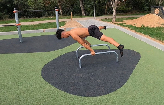 45 mm galvanized diameter tube. At a height of 40cm of ground and a separation between them of 60cm. It has the purpose of exercising the tricep by doing push-ups, backgrounds and vertices, among other tricks.