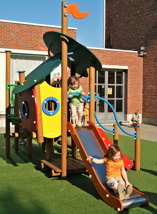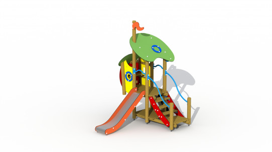 Colorful playground equipment for children aged 2 to 6. The playground equipment consists of a playhouse with a platform height of 93 cm, from which a stainless-steel slide with HDPE polyethylene edges leaves. The playhouse can be accessed via an easy staircase with metal handrails and via a non-slip rock wall. Below a play floor was arranged, on top there is a bench. The whole is covered with a two-fold roof from rounded colorful HDPE polyethylene panels. The roundwooden larch poles have a diameter of 10 cm and are fixed into or onto the ground using metal base supports.