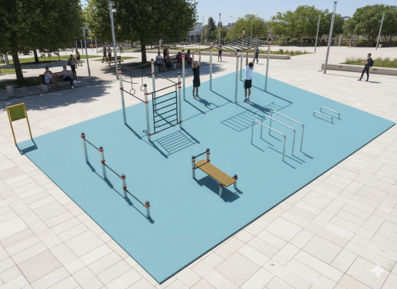 Espacio de entrenamiento físico en la vía pública. Incluye los elementos más importantes para realizar un completo entreno de calistenia.