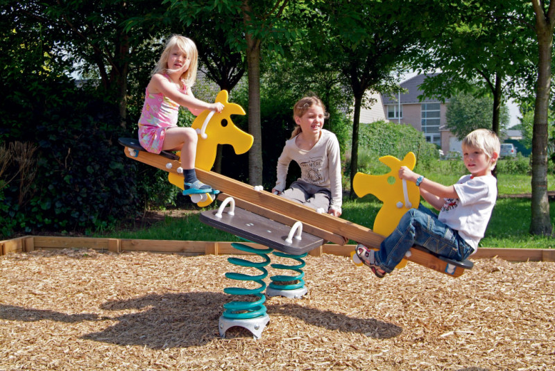 Mobile printemps pour enfants de 2 à 6 ans. Le ressort mobile est composé de deux ressorts revêtus de polyester qui sont montés sur des fixations au sol galvanisées. Une plaque antidérapante en polyéthylène HDPE est fixée sur le dessus du ressort. Aux deux extrémités de la plaque, il y a 2 poignées en plastique et une double poutre de soutien horizontale en mélèze. Aux deux extrémités, un élément de siège figuratif en forme de poney est monté. Ce mobile de printemps convient à 4 enfants. Les personnages et les sièges sont en polyéthylène HDPE anti-vandalisme et de couleur inaltérable. Le ressort est en acier à ressort de 20 mm d'épaisseur. Toutes les pièces métalliques sont traitées contre la rouille et tous les écrous et boulons sont complètement recouverts de capuchons de protection en forme de fleur. Le ressort est conçu pour que vous ne puissiez jamais être pincé, même à la charge la plus lourde. L'élasticité du ressort est calculée de manière à ce que le mouvement se redresse même pour les plus petits.